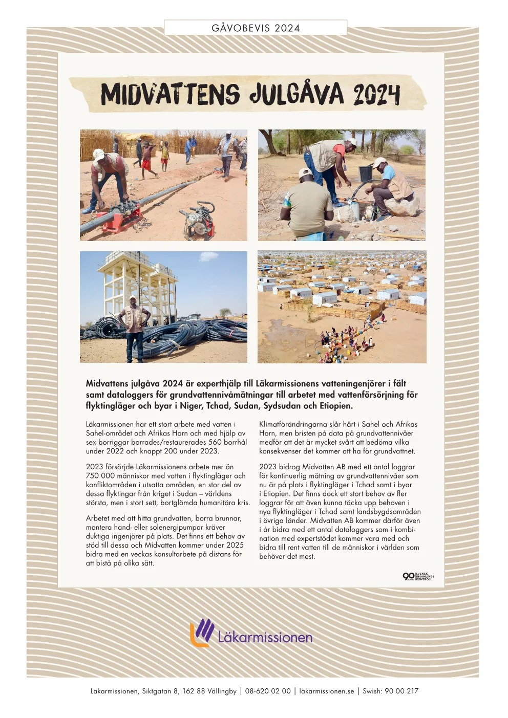 Midvatten är stolta att för tredje året i rad kunna ge stöd till läkarmissionens arbete i Afrika med att säkra vattenförsörjning i områden där det är som allra svårast